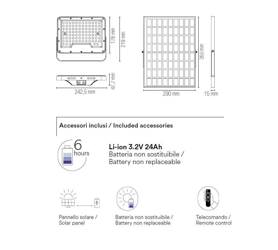 - Batteria da 3.2V 15Ah che offre un'ottima autonomia fino a 6 ore e può essere ricaricata tramite pannello solare;