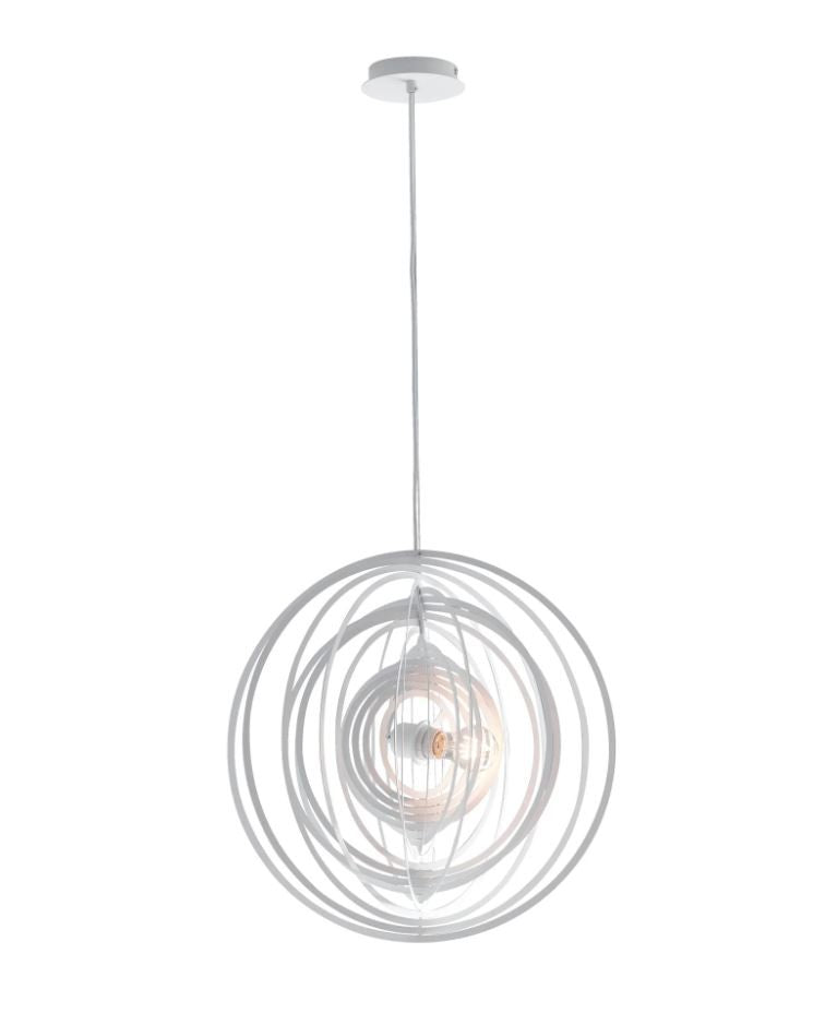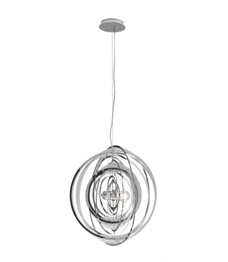 The CLUB pendant lamp by Luce Ambiente Design features a metal structure composed of numerous concentric circles surrounding the single light source. Each element can be oriented to create a customized configuration.