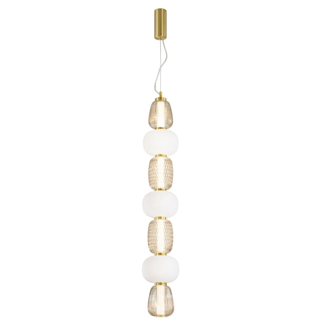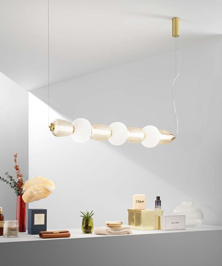 La struttura in metallo finitura oro è abbinata ad una barra luminosa Led tubolare che permette di diffondere una luce morbida e avvolgente, e arricchita da elementi decorativi in vetro soffiato, alternati nelle tonalità bianco opaco e ambra, che creano un affascinante gioco di forme e trasparenze.