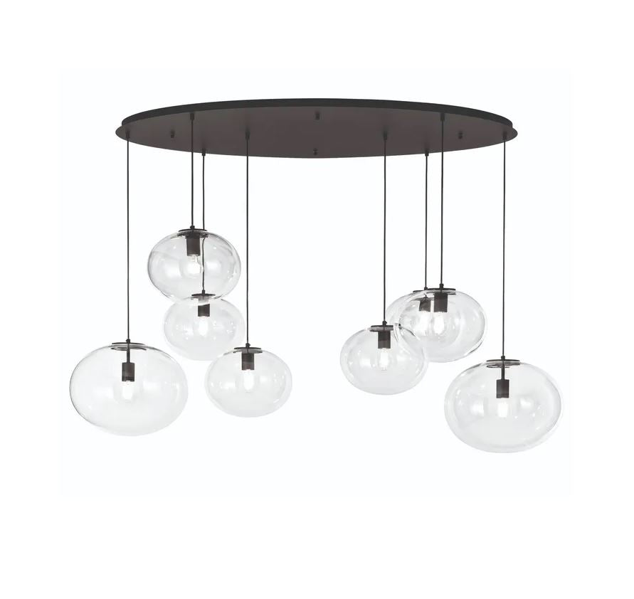 Lampadario a sospensione 8 luci modello GALAXY firmato Luce Ambiente Design, con struttura in metallo nero e composto da bocce di vetro soffiato trasparente dalla forma schiacciata.