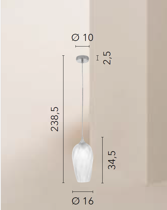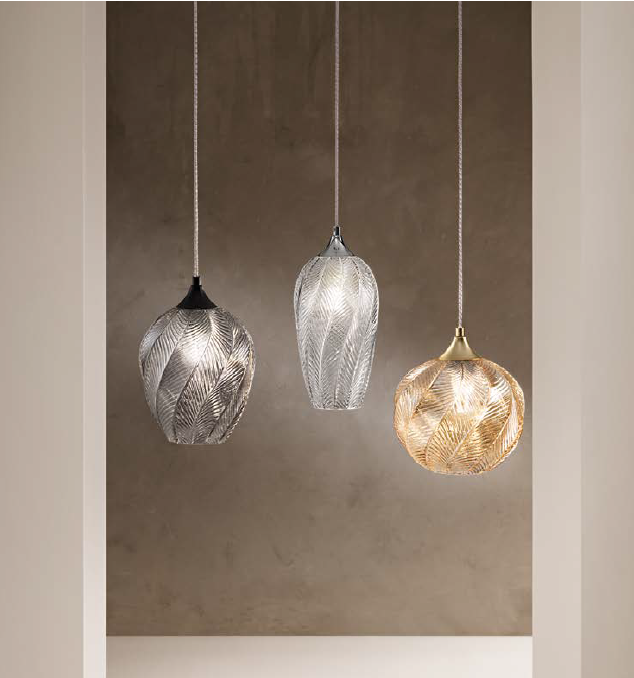 La struttura in metallo è abbinata a un diffusore dalla forma bombata in vetro soffiato caratterizzato da una particolare lavorazione artistica a strisce in rilievo che dona un effetto visivo molto raffinato e contribuisce a creare un'atmosfera luminosa suggestiva e accogliente.