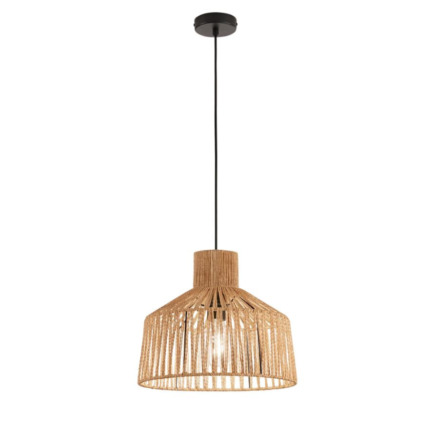 Lampada a sospensione singola modello TROPIKANA S35 di Luce Ambiente Design composta da rosone e montatura in metallo colore nero e diffusore dalla forma rotonda composto da strisce di carta naturale distribuita su tutta la circonferenza.